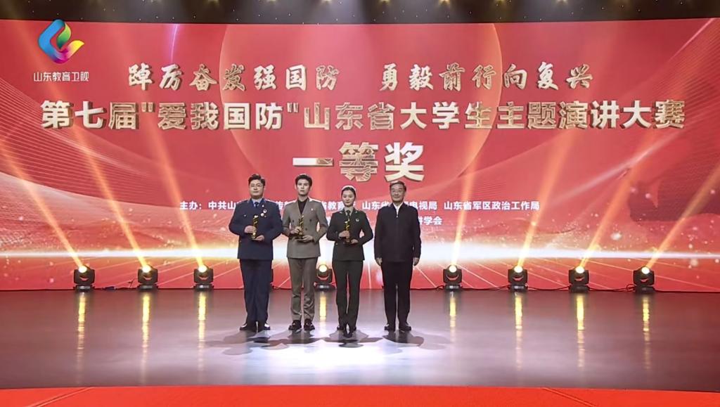 12月6日,由省委宣传部、省教育厅、省广播电视局、省军区政治工作局联合举办的第七届“爱我国防”山东省大学生主题演讲大赛决赛在山东教育电视台演播大厅举行。经激烈比拼,我院汉语言文学专业2023级学生申坤立,以第一名的成绩斩获大赛一等奖。辅导员张甜荣获优秀指导教师奖。