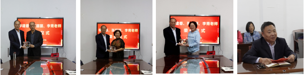 荣休仪式上,朱桂林为三位老师赠送荣休纪念盘。王永超代表学院对三位荣休教师的高尚精神、爱生情怀表达由衷敬意,对他们数十年如一日辛勤耕耘和无私奉献表示诚挚感谢。他回忆了与三位老师共事十余年中的温馨瞬间,感念他们对学院教育事业的辛勤付出,为学院学术发展和人才培养做出的重要贡献;期望青年教师以三位教师为榜样,坚守初心使命,深耕三尺讲台,为学校高质量发展做贡献。