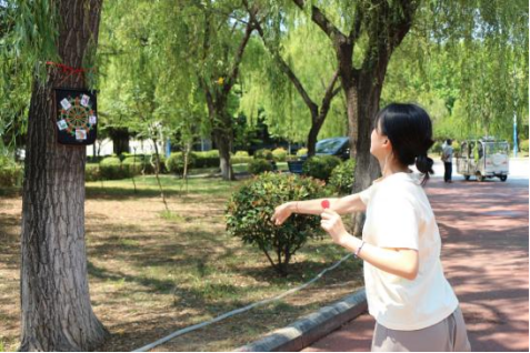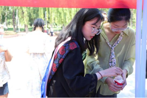 活动分粽语心长、射五毒、寻踪大挑战和DIY香包四个部分进行。同学们按照个人兴趣参与各项游戏:通过动作、语言描述有关端午文化的词组,或将箭矢投向贴有五毒符号的飞镖靶盘,或在活动场地附近寻找粽子挂件,或制作香囊。同学们积极参与,营造了欢快的活动氛围,展示出大学生热爱传统文化的集体形象和积极向上的精神面貌。游戏获胜者还可以赢得挑选五彩绳或制作香囊的机会,寓意着驱除灾害、迎福纳吉。