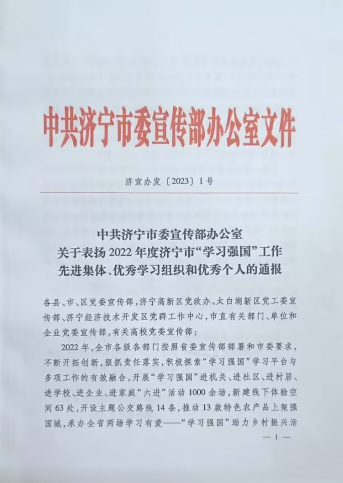 近日,济宁市委宣传部下发了《中共济宁市委宣传部办公室关于表扬2022年度济宁市“学习强国”工作先进集体、优秀学习组织和优秀个人的通报》,授予我校伟德国际victor1946党委 “2022年度济宁市‘学习强国’工作优秀学习组织”荣誉称号。