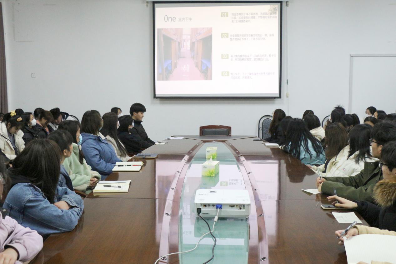 学生会宿管部牟文慧同学通过PPT实例展示,为同学们讲解了宿舍管理制度,从室内卫生、桌面、床铺、宿舍安全四个方面向大家介绍了宿舍检查标准和具体要求,并对宿舍奖惩制度以及学生调宿、查寝相关规定进行了说明。