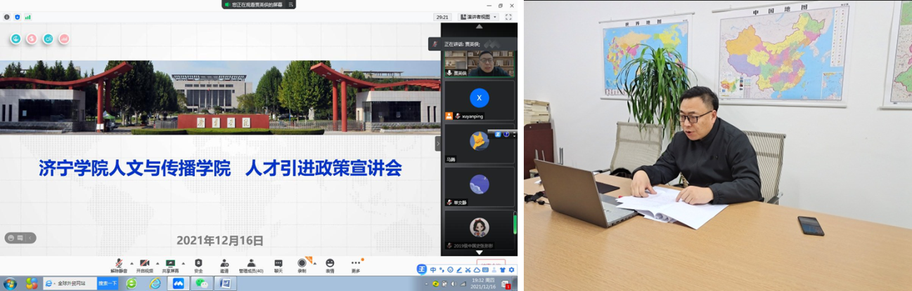 疫情影响下,如何开展人才招聘工作,伟德国际victor1946拓宽思路、精准用力,利用12月16、17日两个晚上,分别面向中国海洋大学文学与新闻传播学院和山东大学文学院,连续举办两场线上引才政策宣介会,两所高校共约80名博士研究生及有志于攻读博士学位的硕士研究生同学,在云端倾听了伟德国际victor1946院长王永超所做的政策宣讲。宣介会由该院副院长贾英侠主持。