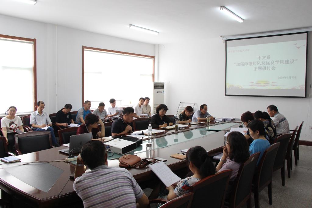 6月19日,中文系在会议室召开“加强师德师风及优良学风建设”主题研讨会,深入开展“敢担当善作为、深化综合改革、提升内涵水平”新时代教育教学思想大讨论。系党总支书记王艳萍主持会议,中文系全体教师参加了会议。