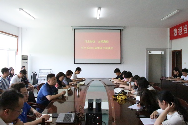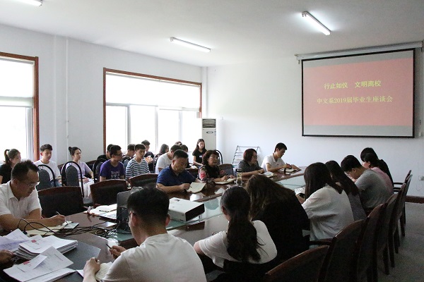 6月4日下午,中文系在文科楼会议室召开“行止如仪,文明离校”2019届毕业生座谈会。中文系党总支书记王艳萍、系主任王永超、党总支副书记李青、各年级辅导员以及2019届毕业班学生干部参加了会议。会议由团总支副书记马永涛主持。
