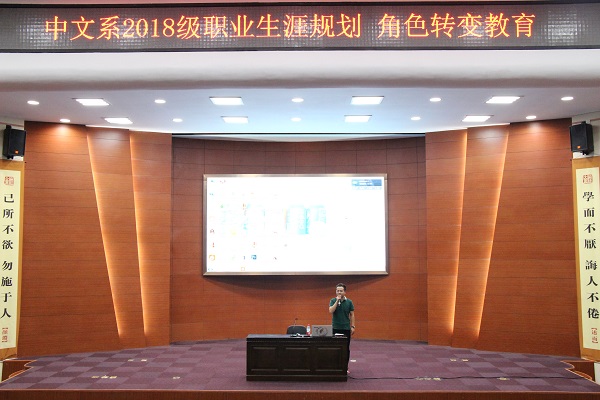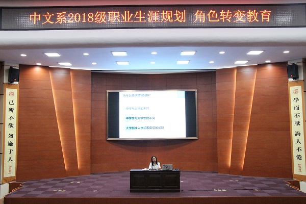9月17日晚,中文系在理科楼报告厅举办“2018级职业生涯规划——大学生角色转变教育”主题报告会。中文系孟冬梅老师为2018级全体新生做了主题报告,系党总支副书记李青等参加报告会。