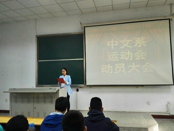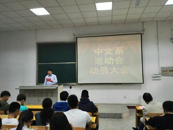 4月25日下午,我系在文科楼B201室举办了2016年春季田径运动会动员大会。中文系主任王钦鸿教授、党总支书记吕祥华出席大会。中文系各年级辅导员、教练、全体运动员、方阵成员代表、啦啦队员、志愿者、运动会工作人员及学生会副部长以上成员200余人参加了动员大会。