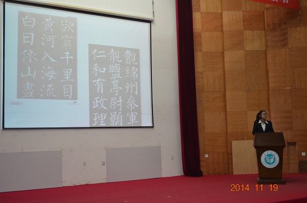 本期桃李讲堂自9月开始选拔,历时3个月,各系同学积极参加,比赛经过了层层选拔,中文系许文轩、杨海垚,计算机科学系姜维轩三位同学最终脱颖而出。本次活动以优美的古典舞蹈开场,进入决赛的三位同学分别从书法、曲艺、文学三方面向大家阐述了我国优秀传统文化的魅力,使在场400余位同学对传统文化有了进一步认识。许文轩同学主讲的题目是《颜真卿的颜勤礼碑》,她结合颜真卿的生平讲述了颜体字形的演变过程和“颜筋柳骨”的来源,并介绍了颜真卿的《颜勤礼碑》,以及颜体所创造出的辉煌;姜维轩同学的主讲题目是《中国曲艺文化》,从古典音乐、相声、戏曲三方面向我们介绍了曲艺艺术,讲述了中国戏曲的演变过程,详细的比较了古代戏曲对当今戏曲的影响。姜维轩用诙谐幽默的语言让同学们了解中华经典,并发出我们每个人都要继承并发扬中华优秀传统文化的倡议;杨海垚同学的主讲题目《儒学的治学与修身》,他从孔子和《论语》入手,通过对孔子、老子以及墨子的比较来讲述治学与修身,通过对《论语》的解释来讲述论语的发展及影响,向大家阐述了如何治学,如何修身,并提出了“会意,达情,做人”的观点。最后2014级辅导员王琪老师上台做点评发言,活动在同学们的热烈掌声中完美落幕。