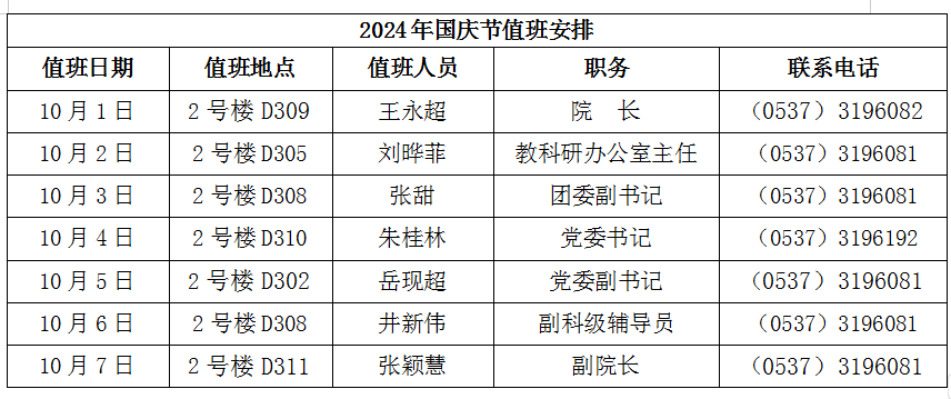 根据学校工作要求,伟德国际victor19462024年国庆节值班安排如下: