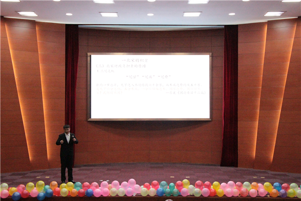 活动在柔美灵动的书简舞表演中拉开帷幕。一号选手通过讲述民族女英雄赵一曼可歌可泣的抗日事迹,带领同学们追忆往昔峥嵘岁月,感受祖国七十年的沧桑巨变,向为国家解放和民族独立献身的革命先驱致敬。二号选手从一把古扇入手,解读“匠心”的深刻涵义,通过介绍敦煌研究院年轻学者们的耕耘和贡献,鼓励我辈青年与时俱进,努力让中华优秀传统文化走上更大的舞台。三号选手从北宋入手的原因,结合历史背景和历史典籍,发表自己对于朝代更替和历史发展的独到见解,严密的逻辑思维,生动的讲解赢得了现场观众的阵阵掌声。三位评委老师对选手们的现场表现进行点评,老师们充分肯定了选手们的选题和准备工作,并就情感把握、演讲内容等方面对选手们提出了宝贵的建议,鼓励同学们在学习好专业知识的基础上,积极研究自己感兴趣的课题。比赛过程穿插精彩的相声和歌曲表演,为观众们带来一场知识性和趣味性兼具的视听盛宴。