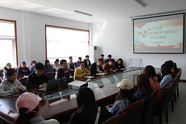 上午9:00,中文系“4.15全民国家安全教育日”学习交流会在四楼会议室举行。会议由马永涛主持,中文系学生会主席刘家奇从全民国家安全教育日的由来、《国家安全法》及开展全民国家安全教育日的意义等方面向与会人员作了全面介绍。大家一同观看了全民国家安全教育日宣传片,宣传片振聋发聩,给大家带来了视觉与心灵的震撼。李青结合具体案例向大家详细讲解了国家安全知识,她希望同学们认真学习国家安全的相关知识,增强国家安全意识,提高安全警惕性,做一个知法、懂法、守法的合格公民。