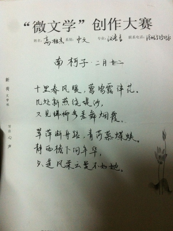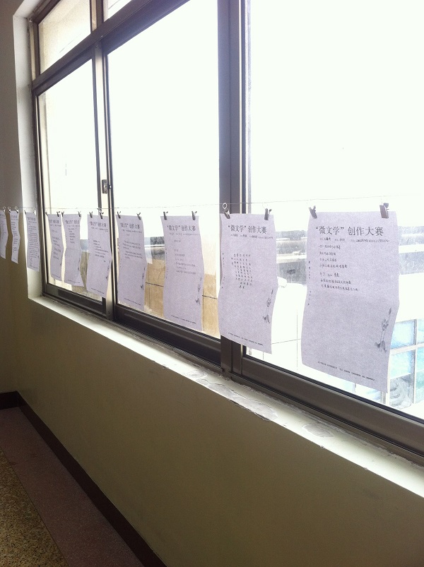 为培养同学们的文学素养,提高大家的写作热情,促进校园文学氛围的形成。11月26日,由中文系团总支主办,中文系新荷文学社承办的“微文学”创作大赛在中文系4楼大厅进行了为期两天的优秀作品展示。
