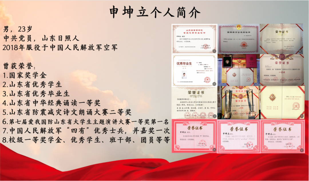 2023 年 12 月 6 日,申坤立代表济宁市参加中共山东省委宣传部、山东省教育厅、山东省广播电视局、山东省军区政治工作局,四部门联合主办的第七届“爱我国防”山东省大学生主题演讲大赛,取得省级一等奖第一名的好成绩!