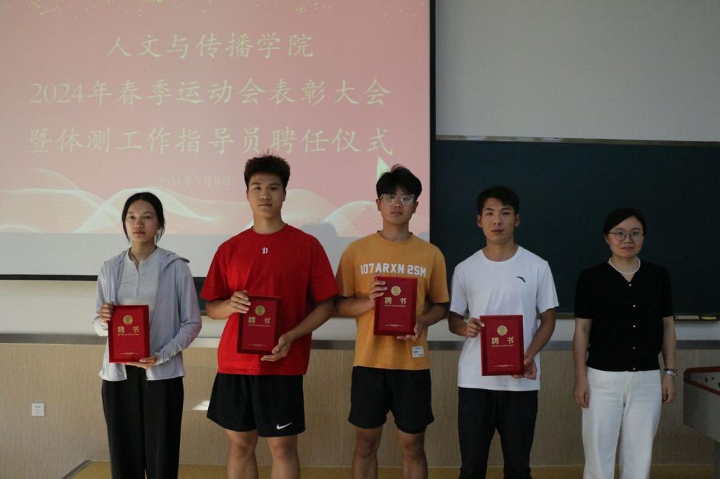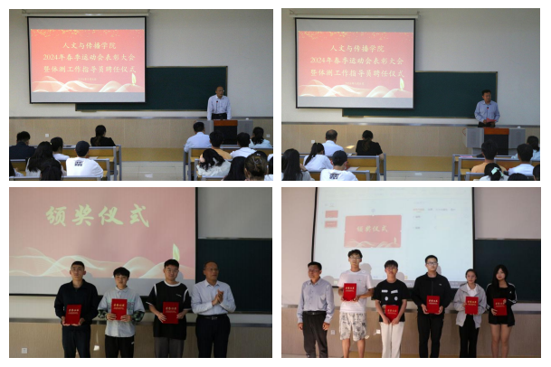 5月8日下午,学院在2B102举办2024年度春季田径运动会总结表彰大会暨体测工作指导员聘任仪式。党委书记朱桂林、党委副书记岳现超、副院长李芬、各年级辅导员及全体运动员、运动会各工作组成员参加。大会由团委副书记张甜主持。