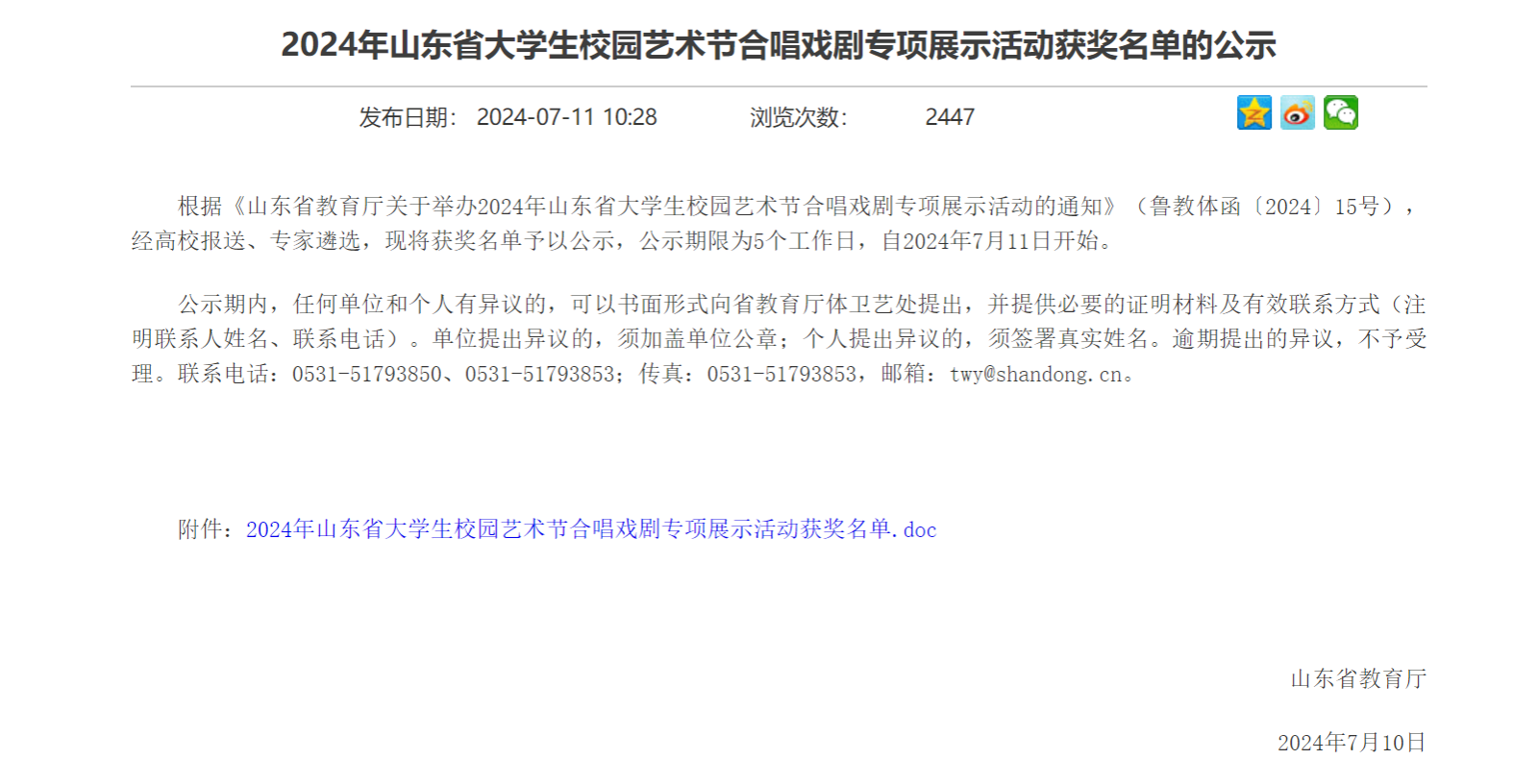 山东省大学生校园艺术节合唱戏剧专项展示活动由山东省教育厅主办,是全省最重要的美育赛事之一,是全省各高校美育成果的交流和展示,本届展示活动以“青春谱写颂歌,礼赞伟大祖国”为主题,旨在激发新时代大学生的爱国之情、强国之志、报国之行,让青春在强国复兴新征程上绽放光彩。活动分为甲组(非艺术类专业)和乙组(艺术类专业)两个组别,共评选出优秀组织奖18个,优秀指挥奖8个,优秀伴奏奖9个,优秀原创作品奖(合唱)7个,优秀原创作品奖(戏剧)9个,优秀表演奖(合唱)112个,优秀表演奖(戏剧)81个。