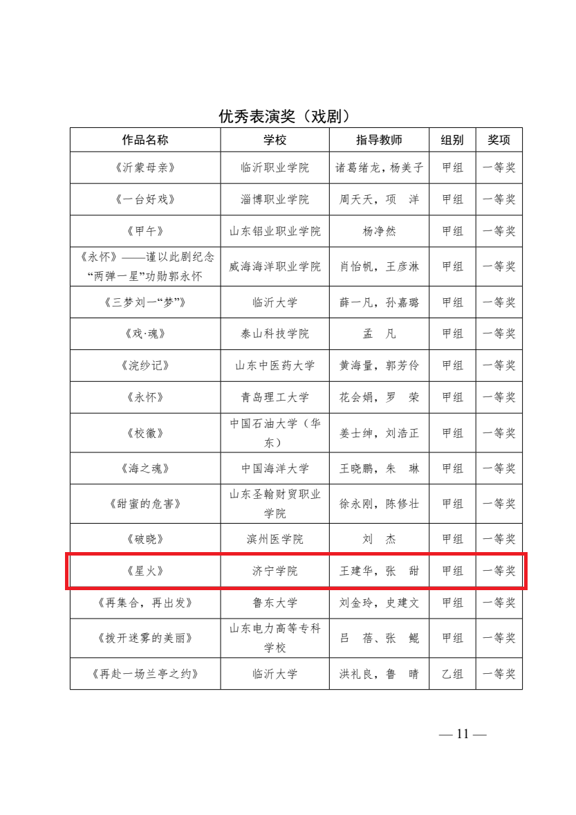 日前,2024年山东省大学生校园艺术节合唱戏剧专项展示活动获奖名单公布,我院报送的原创红色话剧《星火》从众多作品中脱颖而出,斩获戏剧类甲组优秀表演奖一等奖。