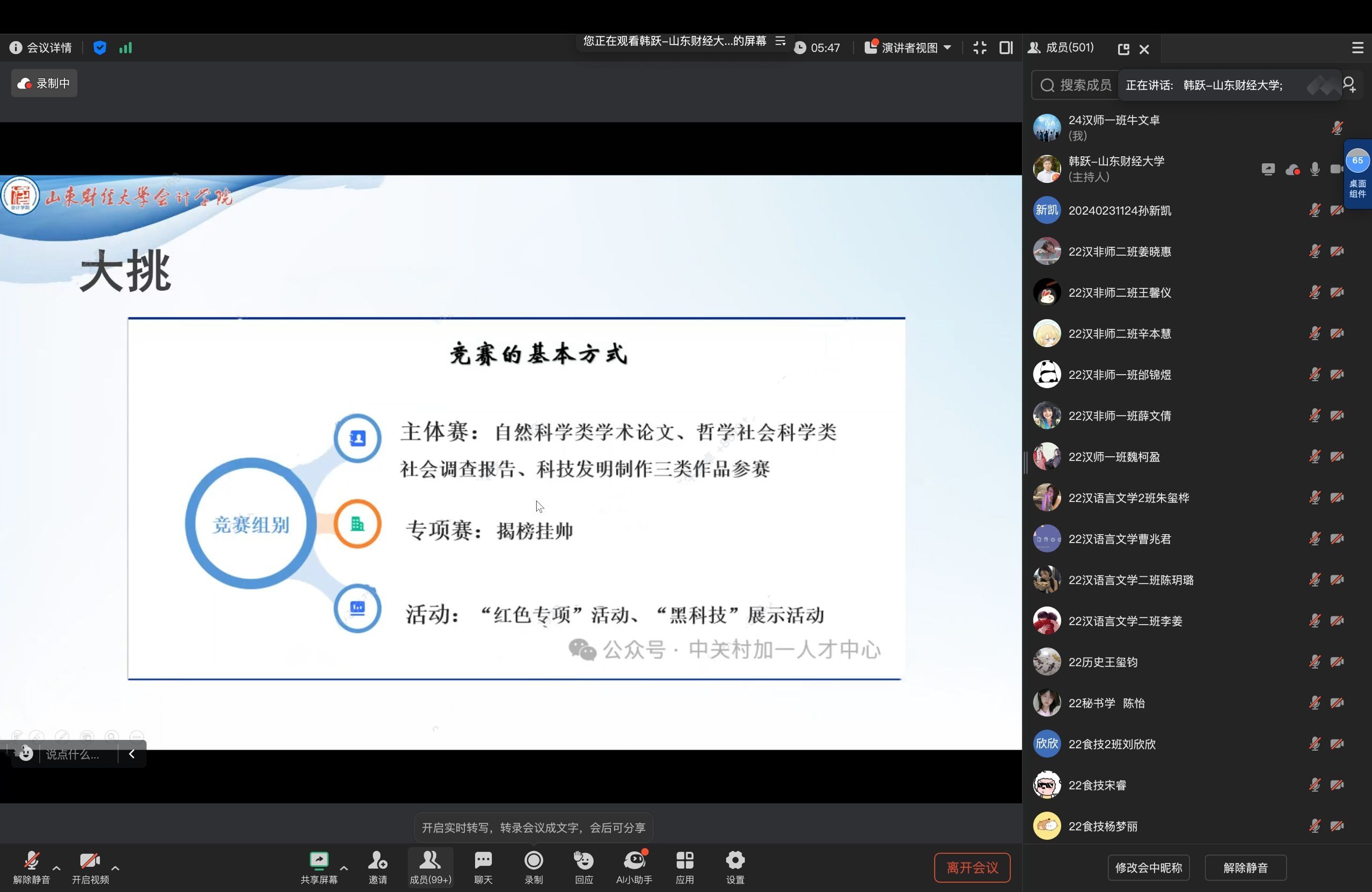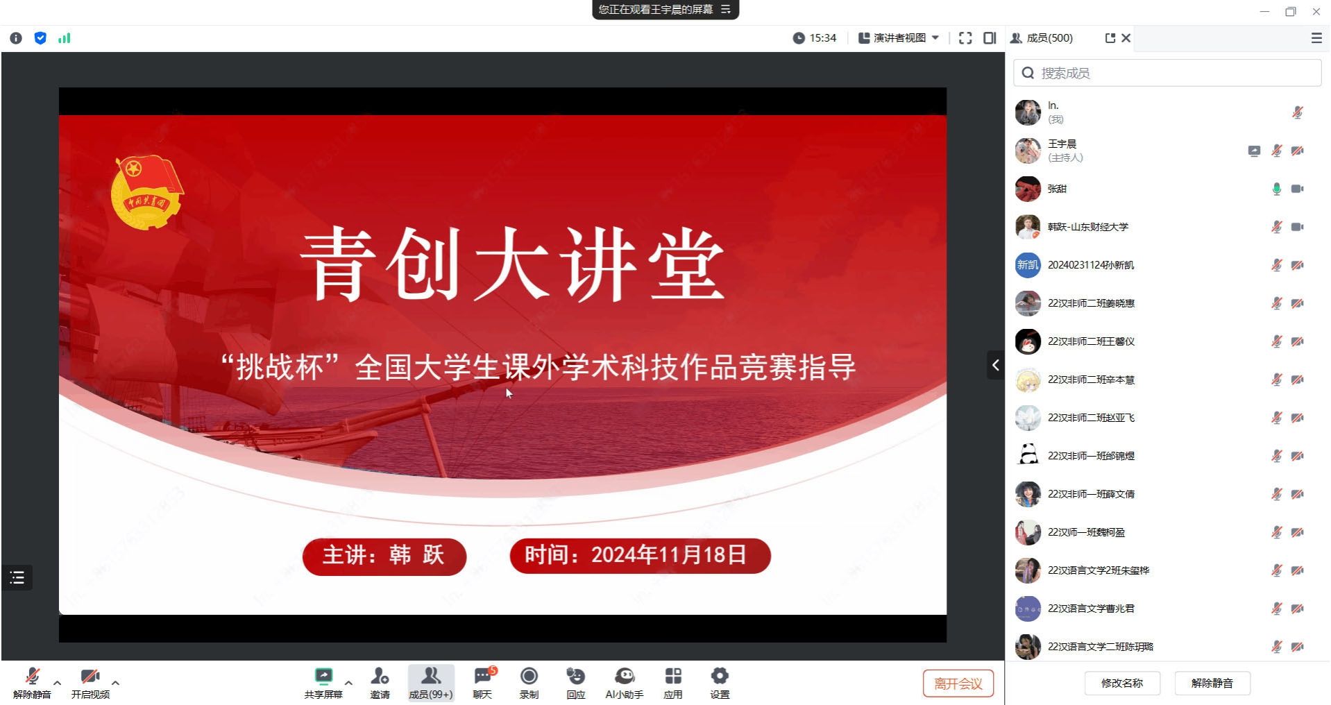 为进一步激发学生双创活力,提升双创育人实效,促进青年创新人才成长,我院于11月18日举办线上“青创大讲堂”报告会。山东财经大学教授韩跃应我院邀请,以“‘挑战杯’全国大学生课外学术科技作品竞赛指导”为题做专题报告,来自各学院500名师生参会。