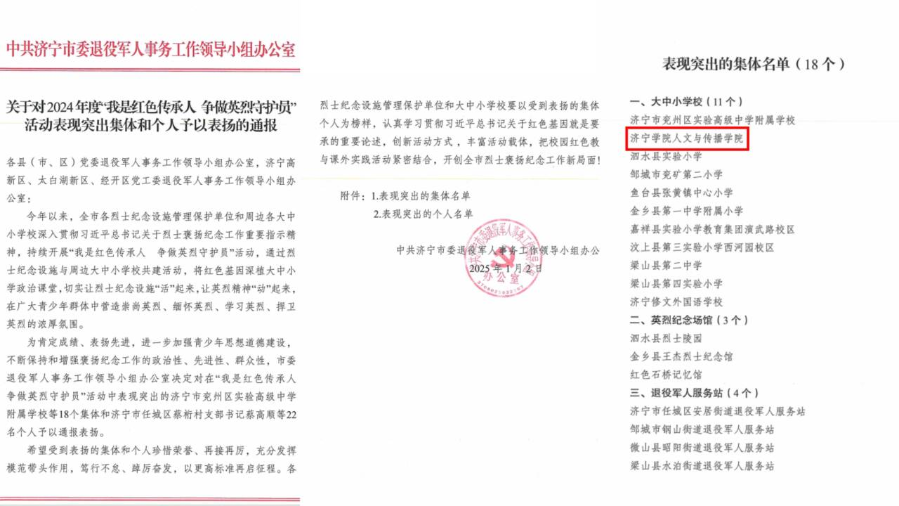 近日,中共济宁市委退役军人事务工作领导小组办公室下发了《关于对2024年度“我是红色传承人 争做英烈守护员”活动表现突出集体和个人予以表扬的通报》,授予我校我院“2024年度‘我是红色传承人 争做英烈守护员’活动表现突出集体”荣誉称号。