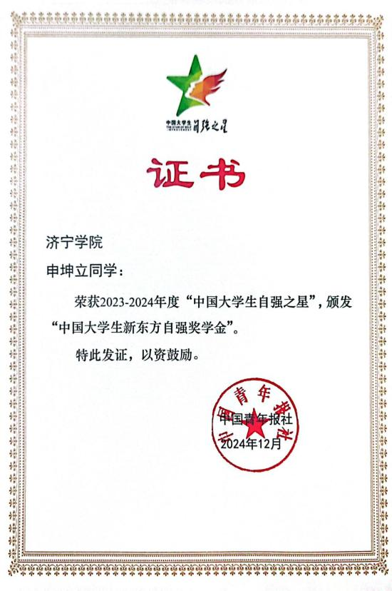 近日,由共青团中央、全国学联指导,团中央基层建设部、中国青年报社、新东方教育科技集团、中国青年创业就业基金会联合举办的2023—2024年度“中国大学生自强之星”奖学金评选结果揭晓,我院学生申坤立在评选中脱颖而出,荣获2023—2024年度“中国大学生自强之星”荣誉称号,获颁“中国大学生新东方自强奖学金”。