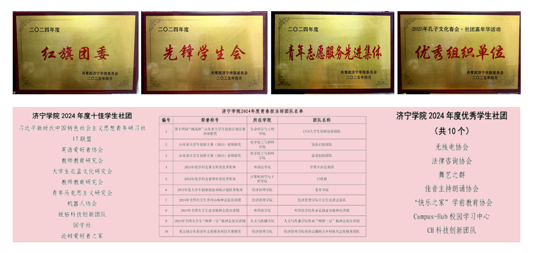 学院团委获评学校 2024年度“红旗团委”称号,2023级汉语言文学专业1班团支部、2023级小学语文教育专业1班团支部获评学校2024年度“五四红旗团支部”称号,刘钰、谷宇翔、李奔腾等9人荣获学校2024年度“优秀共青团干部”称号,郭怡彤、耿玉洁、王新臻等24人荣获学校2024年度“优秀共青团员”称号;学院学生会获评学校2024年度“先锋学生会”称号,焦佳荧、刘杨、丁姝宇等27名学生荣获学校2024年度“优秀学生会干部”称号;大学生孔孟文化研究会、国学社获评学校2024年度“十佳学生社团”称号,佳音主持朗诵协会获评学校2024年度“优秀学生社团”称号,刘子桢、曹锟飞、刘照中等7人荣获学校2024年度“优秀学生社团干部”称号,臧延梁、王传伟、张宇欣等17人荣获学校2024年度“优秀学生社团会员”称号;学院志愿者协会获评学校2024年度“青年志愿服务先进集体”,孟晨、胡佳星、臧涵茜等12人荣获学校2024年度“青年志愿服务先进个人”称号;谷宇翔、李开鑫等7人荣获学校“校园百星”称号;学院传承“两弹一星”精神志愿宣讲团获评学校2024年度“青春担当好团队”称号;学院团委获评2025年“孔子文化春会·社团嘉年华活动优秀组织单位”称号。