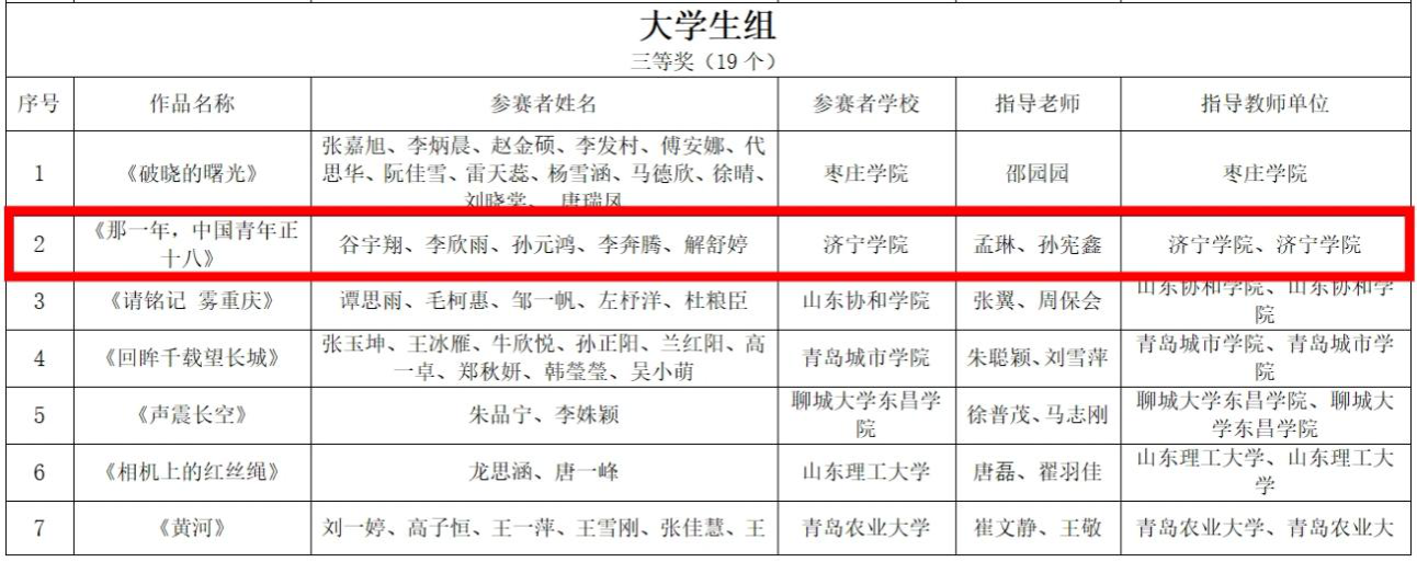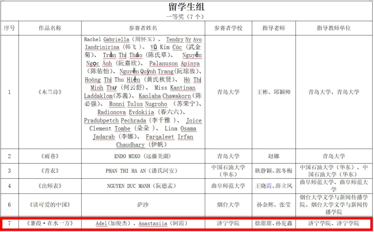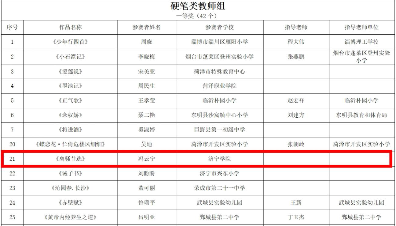 近日,2025年山东省中华经典诵读大赛、山东省中华经典书写大赛评选结果揭晓。我院师生凭借扎实的专业功底和出色的艺术表现,在比赛中脱颖而出,共荣获一等奖2项,三等奖2项。其中,我院徐甜甜老师参与指导的诵读作品《蒹葭•在水一方》荣获留学生组一等奖;我院孟琳老师参与指导的诵读作品《那一年,中国青年正十八》荣获大学生组三等奖;我院冯云宁老师参赛书写作品《离骚节选》荣获硬笔类教师组一等奖;我学院学生刘子桢参赛书写作品《凤吹笙曲》荣获毛笔类大学生组三等奖。