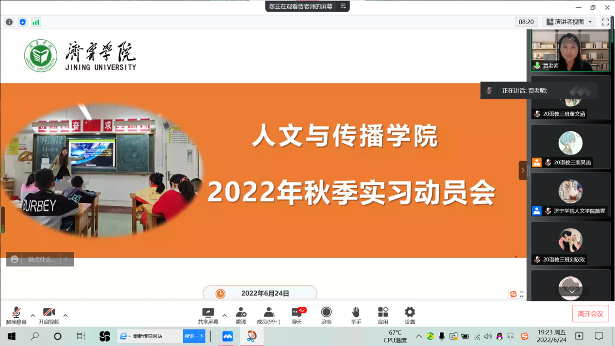 为做好语文教育专业学生的实习支教工作安排,推进实习支教工作顺利开展,6月24日晚,伟德国际victor1946通过腾讯会议平台召开了2022年秋季实习支教线上动员会。该院副院长贾英侠、辅导员颜雯以及2020级语文教育专业182名同学共同参加本次动员会,会议由颜雯主持。