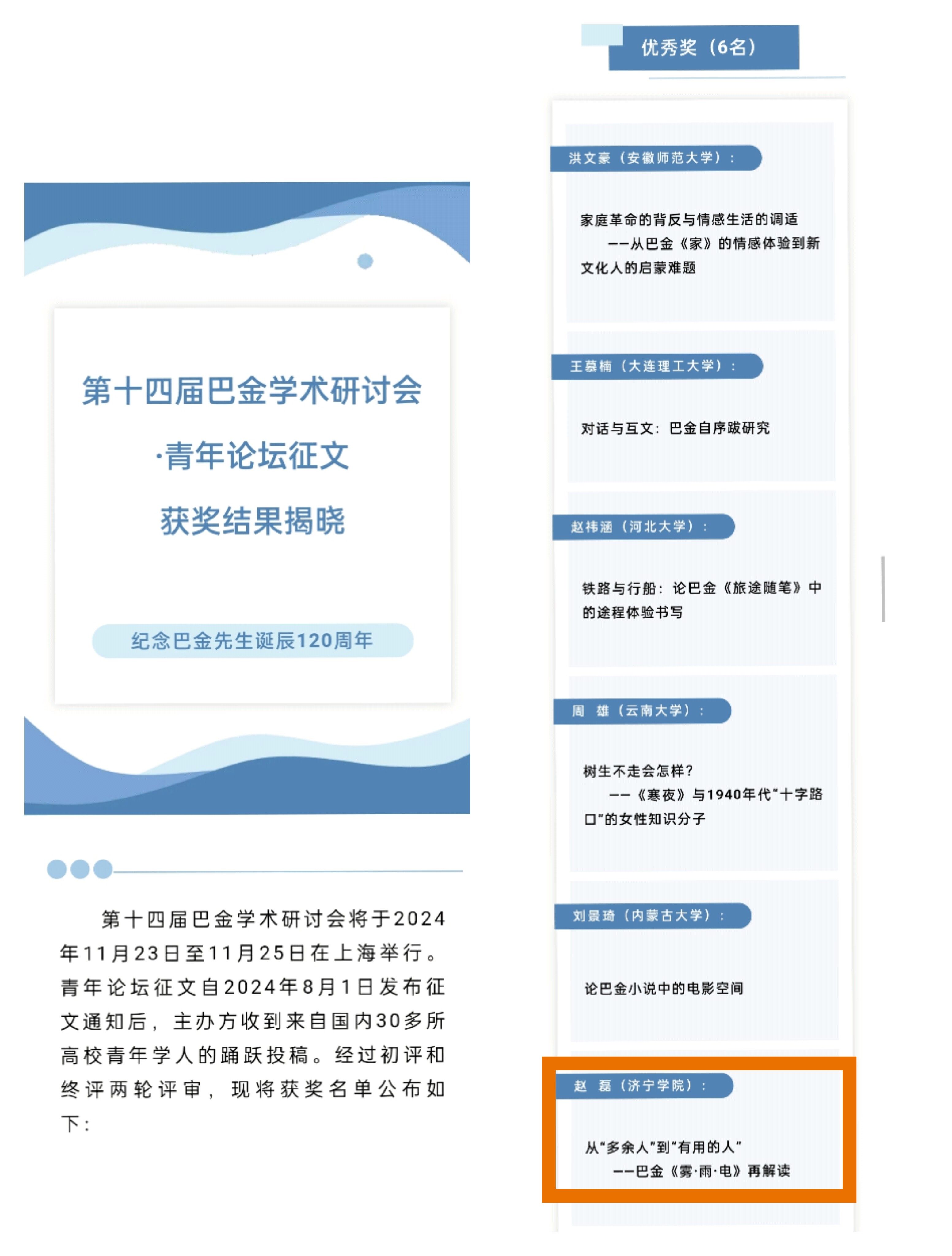 据悉,此次征文活动共有全国30余所高校青年学生投稿,评委会在评选过程中严格坚持匿名评审的原则,赵磊同学与一众清华、复旦、人大、川大、山大的本硕博同场竞技,是唯一学院层次获奖学子。“巴金学术研讨会”由巴金研究会、巴金故居主办,在中国现代文学研究界颇具影响力,至今已举办十三届,并特设“青年论坛”。