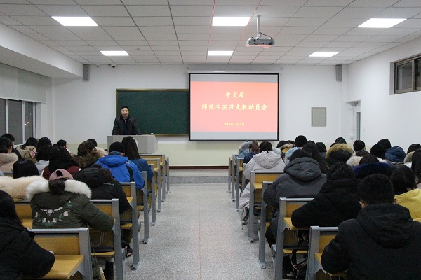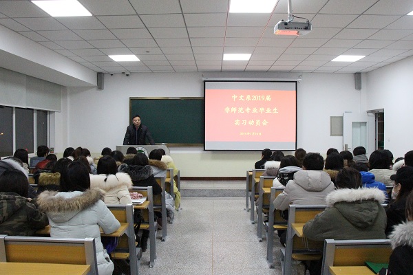 1月10日晚7时,中文系2019届非师范专业毕业生实习动员会在文科楼A306智慧教室召开。系副主任、系实习指导小组组长王永超莅会,并为2015级汉语言文学专业和2016级文秘专业全体同学作实习动员。会上,王永超从“实习目的”“实习内容”“实习时间”“组织领导”“工作程序”“综合实习成绩评定办法”“实习工作总结”和“上交实习材料”等8个方面为同学们详细解读了《中文系2019届非师范专业毕业生实习大纲和计划》。