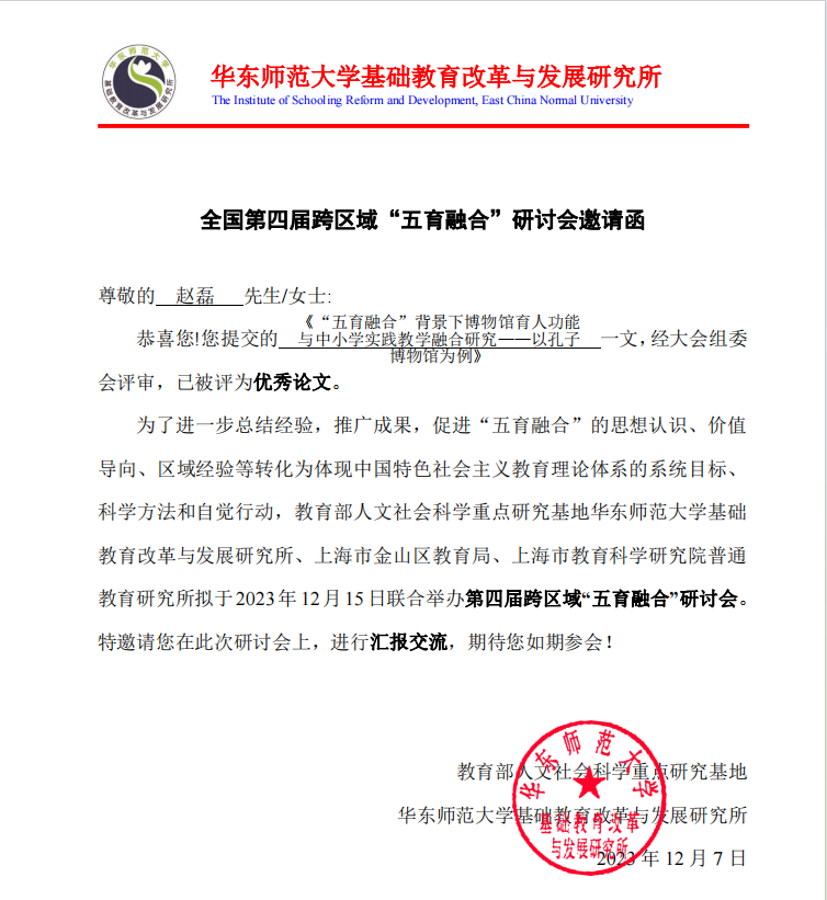 赵磊在会上做了题为《“五育融合”背景下博物馆育人功能与中小学实践教学融合研究——以孔子博物馆为例》的发言。发言受到上海师范大学哲学与法政学院教授冯猛、华东师范大学《基础教育》执行主编张国霖及与会代表的高度评价。