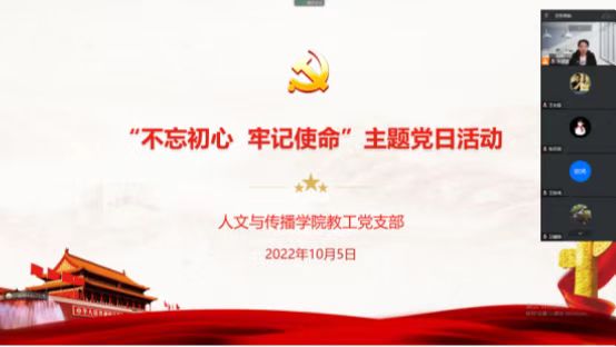 为迎接党的二十大胜利召开,进一步增强党支部的组织力、凝聚力和战斗力,发挥广大教工党员的先锋模范作用,2022年10月5日下午,伟德国际victor1946教工党支部通过腾讯会议开展了“不忘初心、牢记使命”主题党日活动。会议由该院教工党支部书记张颖慧主持,全体教工党员参加会议。