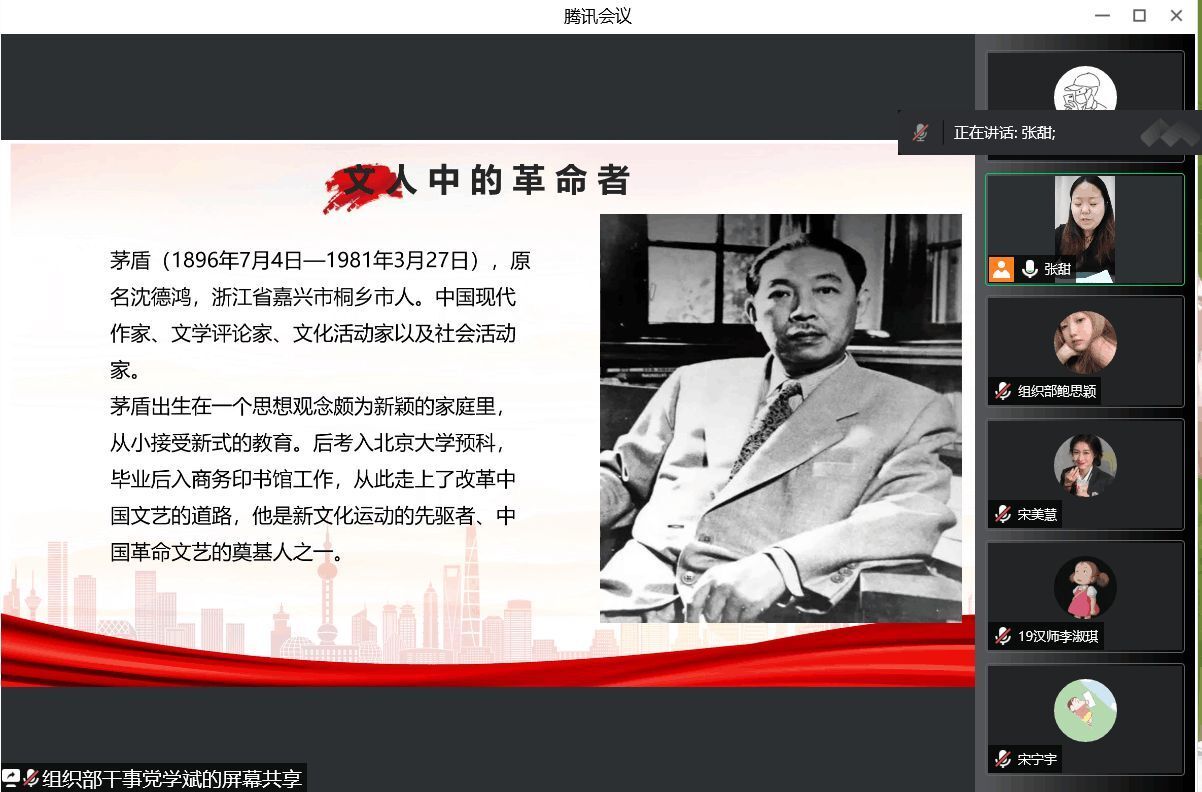 大会第三项,张甜以《文人中的革命者》为题,为党员讲党课。讲述了茅盾先生作为中国共产党最早的党员之一,执笔从戎为无产主义事业奋斗一生的故事。教育引导学生党员传承弘扬革命精神,争做担当民族复兴大任的时代新人。