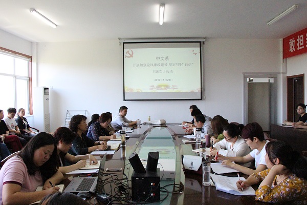 5月29日下午,中文系在会议室开展“加强党风廉政建设,坚定‘四个自信’”主题党日活动。全体教职工党员和学生党员代表近50人参加活动。中文系党总支书记王艳萍主持会议。