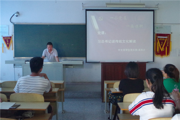 2018年6月28日,学生党支部书记吴宪贞以“习近平总书记谈传统文化解读”为主题为学生党员、学生干部和部分积极分子讲党课。