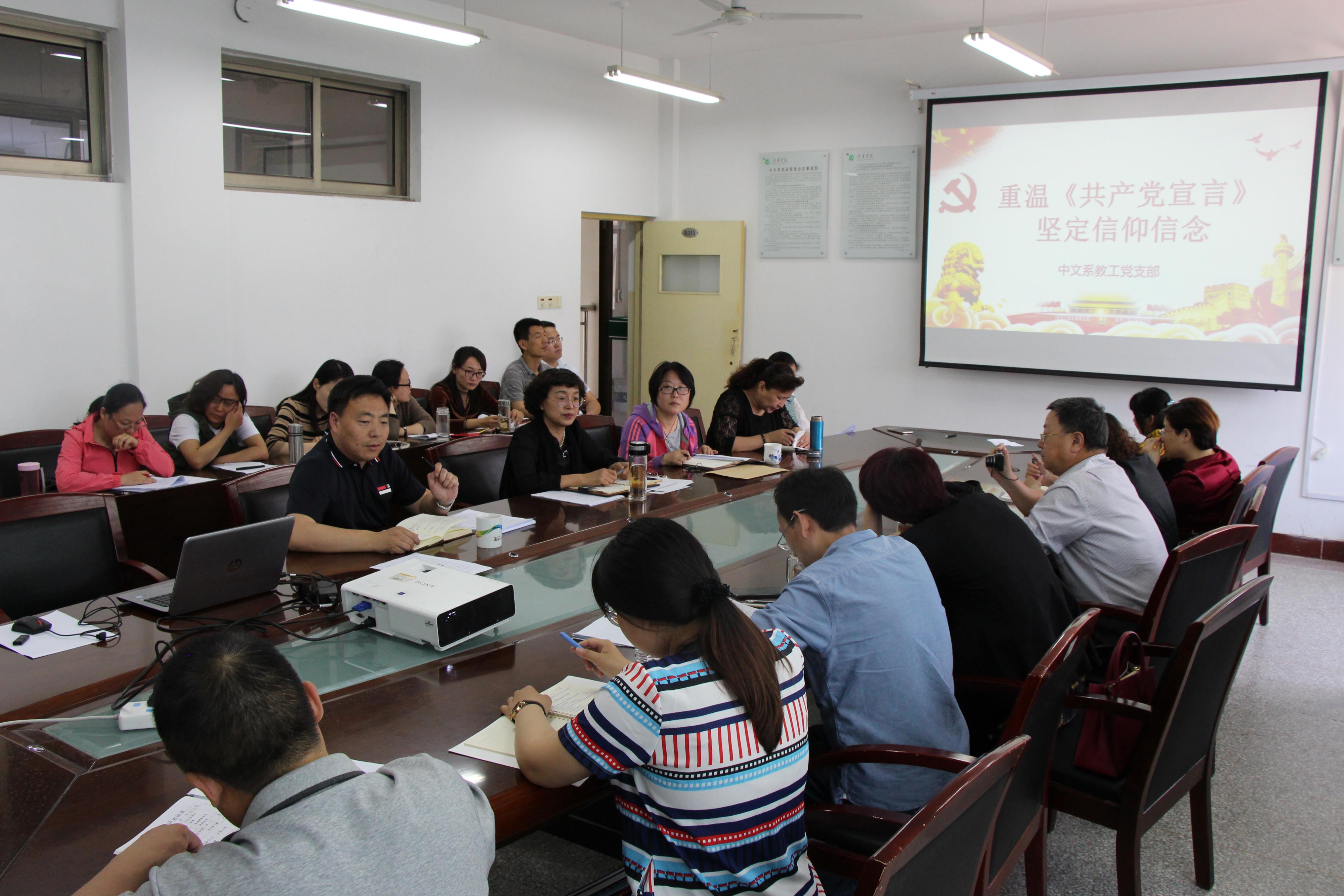 5月23日下午,中文系教工党支部在会议室组织开展“重温《共产党宣言》,坚定信仰信念”主题党日活动。全体党员同志参加会议,系教工党支部书记王永超主持会议。