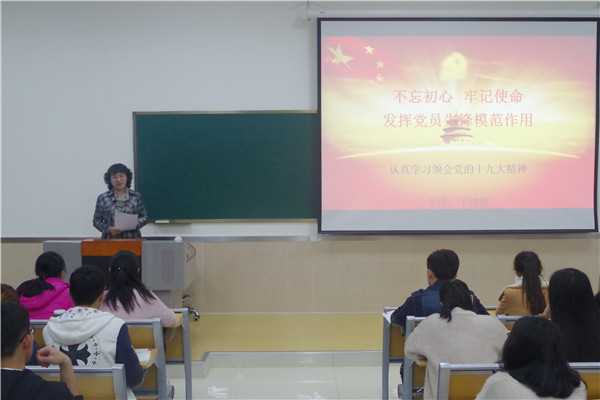 培训伊始,王书记为学员介绍了本期入党积极分子培训的总体安排与要求,强调理论学习与主题实践相结合,勉励同学们认真学习党的知识,加强读书笔记和学习体会的总结。王书记以“不忘初心,牢记使命,发挥党员的先锋模范作用”为主题,从党的十九大精神及基本内容、党章的相关充实修改、两会的基本内容等方面进行了解读。最后,引用习近平总书记论述:广大青年要坚定理想信念,志存高远,脚踏实地,勇做时代的弄潮儿,在实现中国梦的生动实践中放飞青春梦想,在为人民利益的不懈奋斗中书写人生华章!勉励大家做有理想、有本领、有担当的新时代青年。
