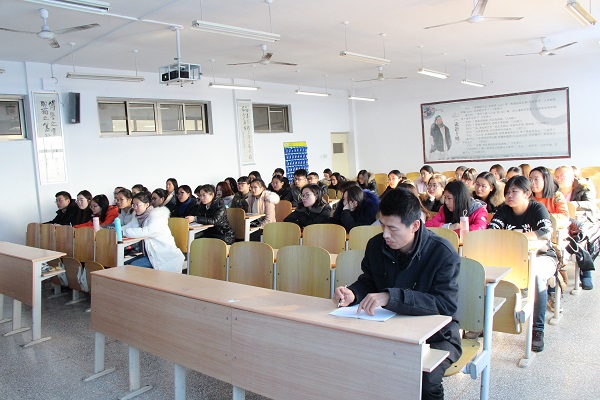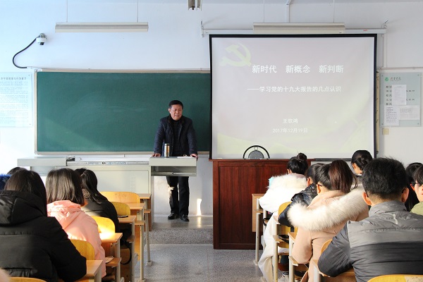12月19日,中文系主任王钦鸿教授在文科楼A505室为2016级汉语言文学师范班进行“十九大精神”宣讲,会议由中文系团总支书记马永涛主持。