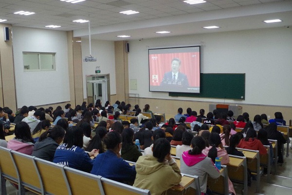10月19日晚,中文系组织2017级全体新生观看党的十九大开幕视频,接收400余名同学提交的入党志愿书。