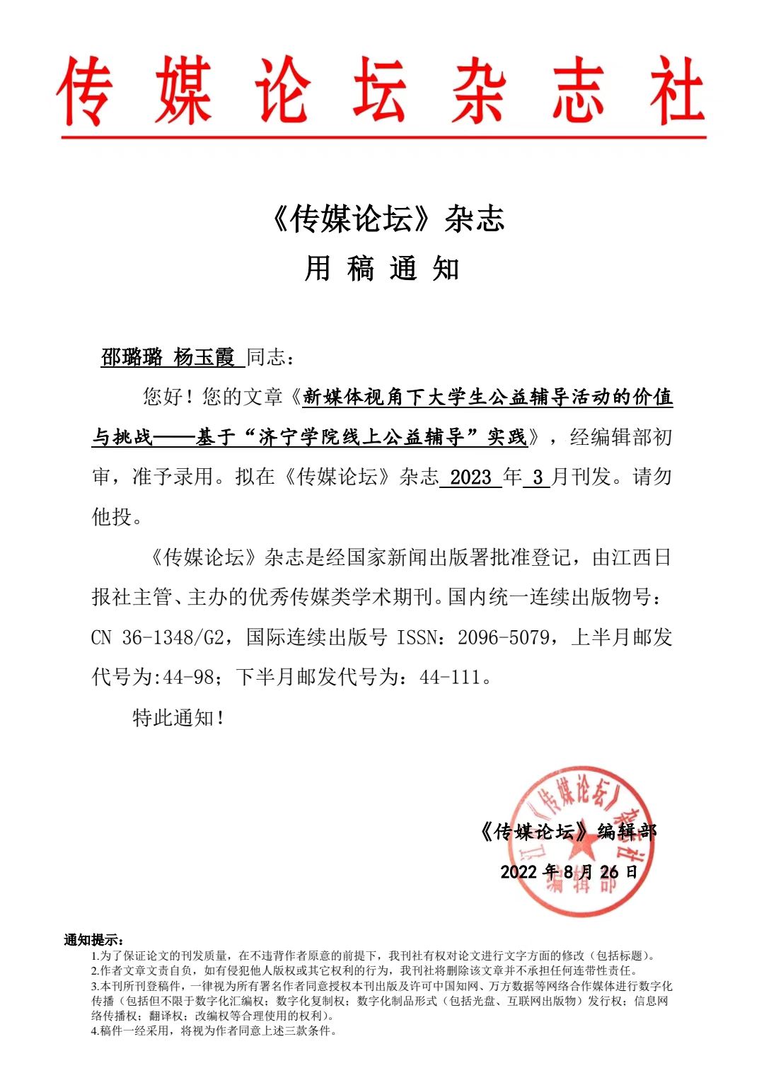 近日,伟德国际victor19462020级网络与新媒体专业学生邵璐璐、汉语言文学专业学生杨玉霞收到了省级期刊《传媒论坛》的用稿通知。通知中说,两位同学的论文《新媒体视角下大学生公益辅导活动的价值与挑战----基于‘伟德victor1946线上公益辅导’实践”》将于2023年3月刊发。