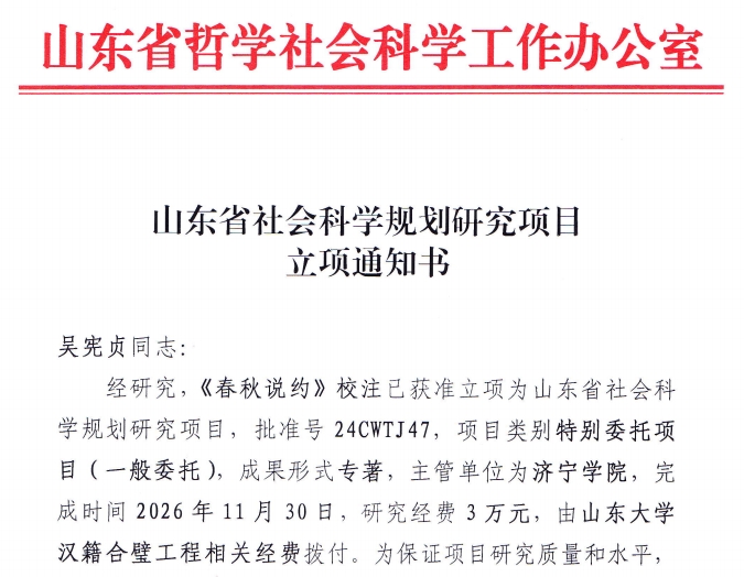 近期,山东省哲学社会科学工作办公室下发《山东省社会科学规划研究项目立项通知书》,批准由我院吴宪贞副教授申报的“《春秋说约》校注”课题立项,批准号24CWTJ47。该课题类别为特别委托项目,配套经费3万元,由山东大学汉籍合璧工程相关经费拨付。这是我院积极探索校校合作、借力发展,主动对接、参与知名高校国家重大委托课题研究的又一重要成果。