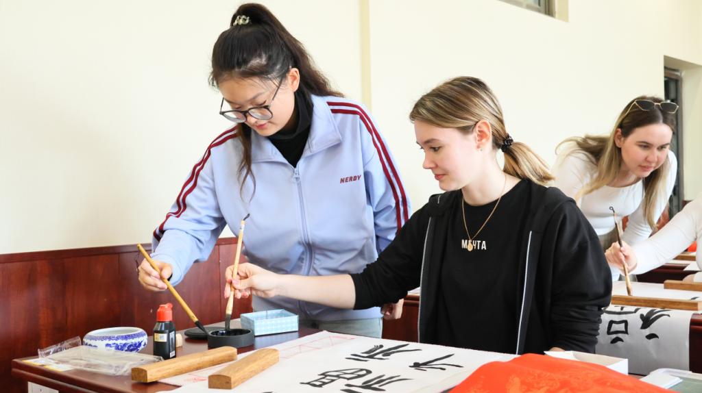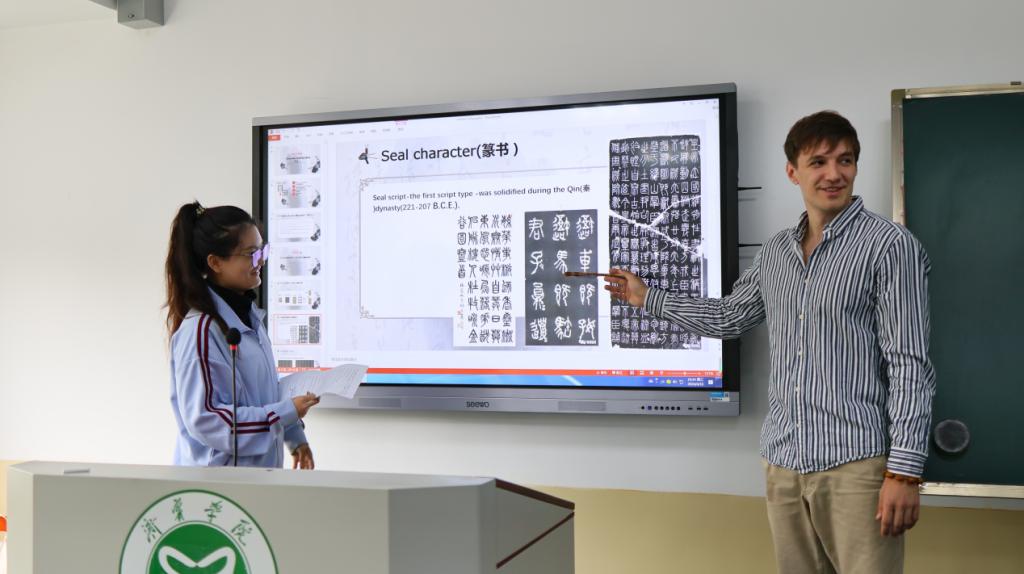 此次文化交流活动中,杨璐泽作为主讲人以《中国软笔书法》为题,从中国书法文化概述、毛笔书法演进过程、各个书体的特点、文房四宝以及毛笔握笔姿势四方面进行讲解,随后进入伟德国际victor1946三字培训基地进行实践,主讲人杨璐泽讲述毛笔书写前的准备工作,如何蘸墨刮墨等具体动作,并以“福”字的篆书、隶书、楷书和行书四种书法书体进行现场示范,向外国友人展示中国书法文化的博大精深,满足俄罗斯来华留学生的多样性学习需求。最后,同学们亲自在红纸上书写“福”字,作为本次学习的最终成果,也代表学院对他们最真诚的美好祝愿。本次文化交流活动不仅获得了留学生群体的好评,并且有效地传播了中国声音,弘扬中华优秀传统文化,让留学生充分感受传统书法文化的魅力。
